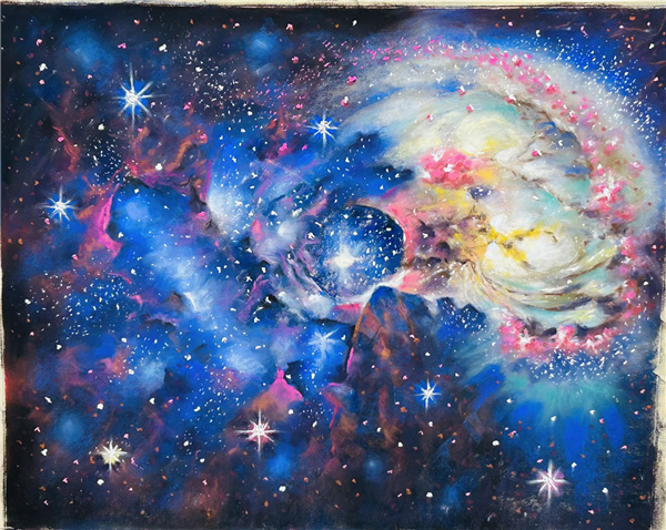 如果说《中华颂》是张彤卫对传统文化的致敬,那么她的“宇宙系列”作品,则是她对艺术边界的大胆突破。近年来,她经过多年对矿物材料的研究与实验,创新性地将天然矿物粉末与油画颜料结合,创作了多幅探索宇宙奥秘的作品。这些作品中,她将古代神话传说中的“盘古开天”“嫦娥奔月”与现代天文学中的星云、黑洞、星系相结合,用斑斓的色彩、抽象的构图,描绘出浩瀚宇宙的神秘与壮丽。在《星河之约》中,她用孔雀石粉末调出深邃的蓝绿色,模拟星云的流动;用赤铁矿粉末勾勒出金色的星轨,仿佛神话中的鹊桥横跨星河;画面下方,隐约可见敦煌壁画中飞天的剪影,与上方的现代星空交相辉映,既有古典艺术的浪漫,又有现代科学的严谨。