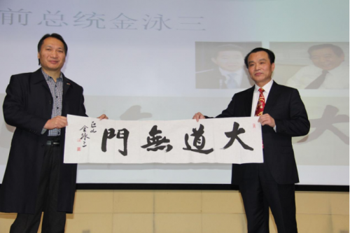 中韩文化交流协会会长王绘先生代表韩国前总统金泳三向诺金公司赠送书法作品:“大道无门”