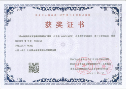 主持国家卫生健康委“十四五”规划全国重点课题“诺金体悟抗新冠病毒活性研究”荣获科研成果一等奖。
