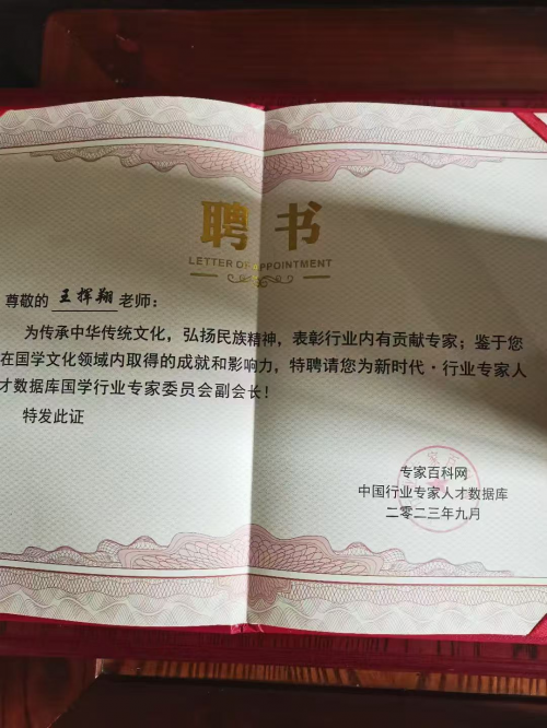 王挥翔大师以其卓越的成就,在学术界和社会赢得了极高的荣誉。他是中国东方文化研究会对外经济文化工作委员会的易学专家委员,肩负着传承和弘扬易学文化的重任。中国国学行业专家委员会授予他“中华国家级风水师”称号,这是对他在风水领域深入钻研的认可,如同“欲穷千里目,更上一层楼”。他站在了行业高处。中国专家百科组委会赠授的“国学楷模牌匾”,更是对他国学素养和实践的崇高赞誉。在2023年陕西易理风水起名大赛中。他如战场上的常胜将军,一举夺得了第一名冠军金奖,那是他实力的明证,亦是他智慧的勋章。他就像一盏明灯,照亮了无数人在生育和取名之路上前行的方向,成为人们心中当之无愧的国学大师。