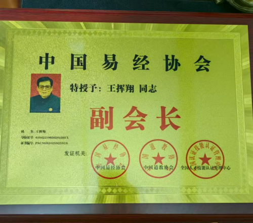 19、中国易经协会、道教协会、全国技能认证管理中心授予王挥翔“中国易经协会副会长”牌证。