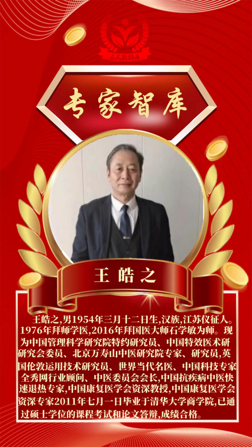 王皓之,男1954年三月十二日生,汉族,江苏仪征人。1976年拜师学医,2016年拜国医大师石学敏为师。现为中国管理科学研究院特约研究员、中国特效医术研究会委员、北京万寿山中医研究院专家、研究员,英国伦敦运用技术研究员、世界当代名医、中国科技专家、全秀网行业顾问、中医委员会会长,中国抗疾病中医快速退热专家,中国康复医学会资深教授,中国康复医学会资深专家2011年七月一日毕业于清华大学商学院,已通过硕士学位的课程考试和论文答辩,成绩合格。根据《中华人民共和国学位条例》的规定,授予医学科学硕士学位。