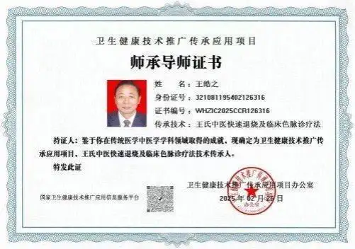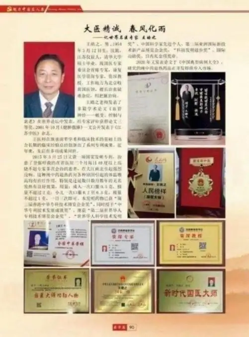 王医师在继承前辈学术和临床技术的基础上结合长期的临床经验创新出了系列专利成果。近年来,先后有多项成果问世。2015年3月25日又获一项国家发明专利,治愈了登报呼救的在省医院三月每日40度以上高烧不退专家多次会诊的患者,在大江南北引起强烈反响。其发明的“一种退热药物及其制备方法”专利号:00121310.5公开了一种用于退热治疗的药物,他运用了驴骨、鳖甲等纯中药材。本发明药物对各种原因引起的体温增高均有治疗作用,特别是迁延数日数月数年的无名发热有良好效果,已获“第三届香港中华专科技术博览会金奖”,同时授予“中华专利技术发展成就奖”、继获“第二届世界华人专利技术博览会金奖”、“世界华人科学技术发明奖”、第二届亚洲国际新技术新产品博览会金奖,“科技发明进步奖”、日内瓦金项奖章。