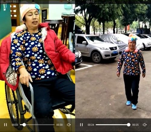图为胃癌患者治疗前坐轮椅不能站立行走,治疗后精神抖擞,满面红光。