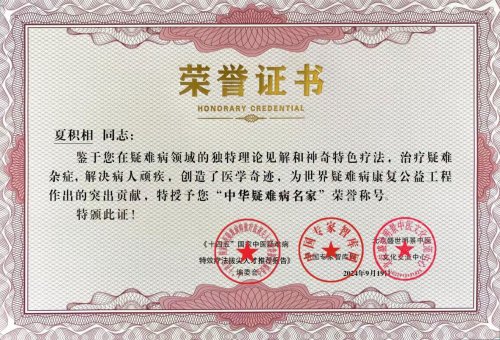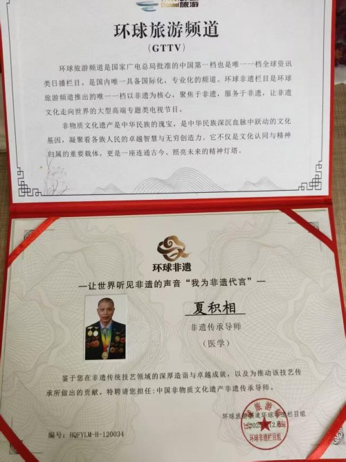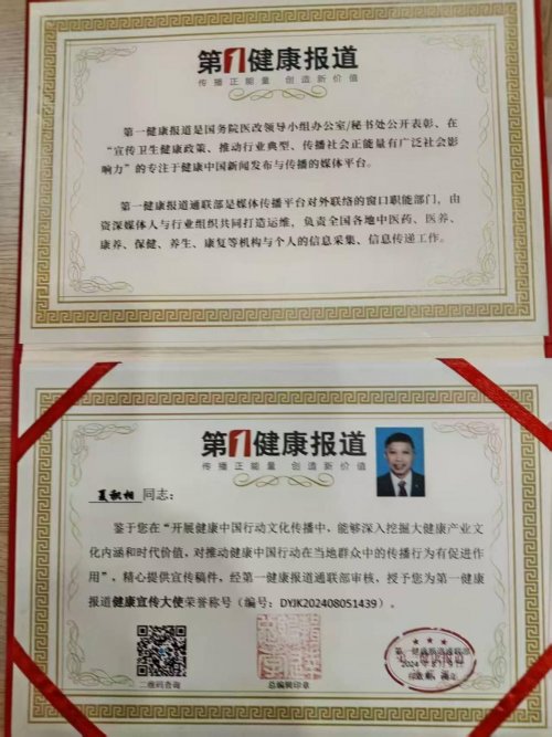 健康中国行动:讲述健康好故事,传播健康品牌好声音,第一健康频道授予夏积相老师“健康宣传大使”荣誉称号。