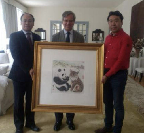 为推动中、西两国文化交流,刘中先生向西班牙驻华大使卡内罗先生赠送中国画《熊猫中中和猞猁》