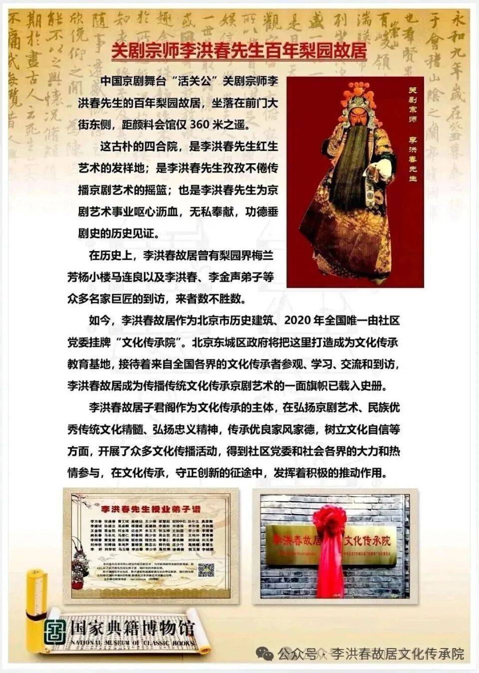 为响应市委领导把北京建设成为演艺之都,博物馆之乡的号召,2025年10月8日上午10时,在关剧宗师李洪春百年梨园故居,隆重举行了李洪春故居《文化传承院》党委授牌五周年庆典,暨《李洪春艺术馆》落成开幕仪式。