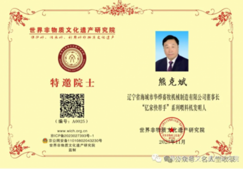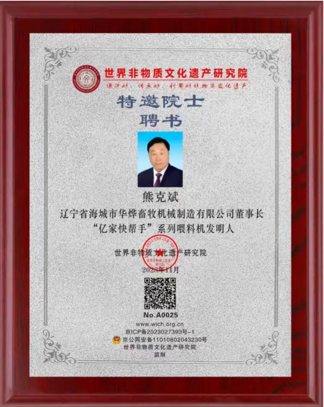 2019年9月,华烨畜牧机械制造有限公司被中国管理科学研究院、《中国商会》杂志社等联合授予“全国百佳科技创新示范基地 ”。12月公司获得“全国机械制造行业龙头企业 ”殊荣;中国新长城组委 会授予熊克斌及企业“2019中国长城品牌人物”、“2019中国民族品牌”;