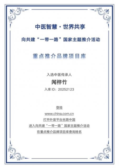 近日,闻梓竹以“中医传承人”的身份,成功入选“一带一路”国家主题推介重点推荐品牌库,并获得专属入库ID,可在中国网“丝路中国”平台查询验证。这不仅是对一个青年传承人的肯定,更是对“数字原住民参与非遗传承”这一时代趋势的积极回应。