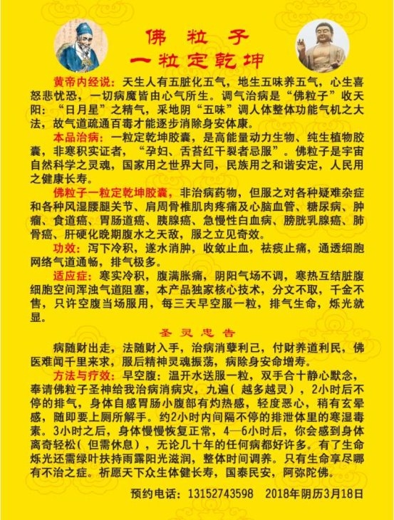 僧伽吒经说:世间之父母,菩提心第一,说此法门者,第一善知识,听此法门者,必作无上尊。善身子:何者是身。身名火聚,身名烧然,身名遇痴,身名崩坏,身名刺聚,身名丘塚,身名水泡,身名重担,身名生恼。身名老、病、苦、恼,身名为死、爱、别、离、怨、憎、贪。善身男子:云何名死,云何名生。识灭名死,福德因缘,识起名生。名为身者,有无量亿筋脉相缠,身有八万四千毛孔,复有八万四千户蟲在中而住。彼诸蟲等,亦有死灭。人将死时,诸蟲怖畏,互相啖食,受诸苦痛,男女眷属生大悲恼,近相食啖,诸蟲相食,唯有二蟲七日斗诤,过七日己,一蟲命尽,一蟲猶在,如彼蟲斗临死不息。佛言:凡夫众生亦复如是,云何不修正念之观,何不作诸善根,汝于阎浮提,何不布施:在佛众生与诸佛前种福田,修诸善法,种善根种子。 当我们看到三千年前如来佛这段高论,对比现代高科技镜下的微观世界,有什么区别呢?可见《金刚经》云:如来是真语者,实语者,如语者,不诳语者,不异语者。若善男子,善女人,于后来世,有受持读诵此经,所得功德,我若见说者,或有人闻,心即狂乱,狐疑,不信,须菩提,当知是经义不可思议,果极亦不可思议。我们人类面对茫茫宇宙,细微病毒疾病缠身,研究观察就是要了解大自然,掌握大自然为人类服务,无论我们怎么运用尖端科学观察也难达到,象佛一样的如此了解大自然全貌。我们每一个人在生活中,都深受着佛粒子“意识心”的佑护。今天“场电学”“息场论”“波率结构量值”“佛粒子”“意识心”的诞生,明明白白的告诉了我们生活需要佛法来呵护。维持生命整体习性,才能健康长寿。需要学习佛法,掌握完整的医学概念。完整的医学概念,需要设立国家级中西医佛学疗养院,“佛粒子”的确定,重新谱写生物系统转化多元层次的科学理论,从而使科学会变得完美无缺,中国医学是世界上最完整的医学,场电学波率结构量值是功能医学的最高境界,也是世界医学结构层次运动形式,运动状态的内在动因,它从生命的源头开始,不治己病治未病,防患于未然才是治病的最高境界。一切生物原始细胞是由阳光子、阴光子、佛光子组成,它们的和谐点是“佛光意识心”。连接:日光喜大孝光,月光喜大爱光,星光喜大善光。起动这六光为身体永保常青和谐,无意识的布施是助化剂,为此佛说:喜施获福,叫资生施是滋养生活根的布施。人体的本能就是“贪”、“乐”、为食,因五味营养元素失衡,风寒暑热燥湿环境污染而患难缠之病。一要正确的诊断,精准的用药治疗能解决三分之一病。二是规律的作息,合理饮食,调解占三分之一病。三是心灵的解脱,压力释放也占三分之一。三法同步进行百日筑基治疗,可起到事半功倍的疗效。一是必须采用中西医结合同治,二是饮食调解,三是采用读佛经、念咒,慢慢唤醒沉睡的细胞,加强活动磁场调解阴阳平衡,只要你坚持用药治疗,合理的采用饮食调解,再加上以实际行动把自己献给佛,每天坚持读佛经,就会调动增加细胞自身的光合作用,细胞放松心灵就会明亮。以上的浅谈是我二三十年来临床经验的总结,我为了治疗自己这个多病多灾的业身病体,深研医学,亲身体验,统观自然发现场电学统一场波率结构量值,科学佛粒子,并且临床验证,这个层次的整体免疫调治之方法,并研制开发纯中药水制丸,如四补哮胀丸,命门续通丸,胃肾康胶囊,治痿抗衰老胶囊,治疮痒除邪抗癌胶囊,高效筋骨宁胶囊,失眠胶囊,速效化痰止咳胶囊等,都是调解内分泌功能场电磁波紊乱,治疗波率结构量值层次转化的奇效药,其主要是针对能量偏移所致的疑难杂病,非常有效的新型药。这些成果我已在临床上应用十年之久,没有任何副作用,现在只能给我身边有缘的少数人服务。科学是国家共有的,每一个公民都有提供科学新发现的义务,也有享受国家支持开发的权利,我不图什么回报,只求完成我的使命,把这一发现献给国家以求的人类的和谐健康。