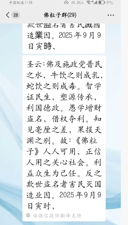 圣云:佛及施政党普民之水,牛饮之则戏乳,蛇饮之则成毒。智学证民生,塑源传承,利国扶正。愚学增财盗名,借权夺利,知见亳厘之差,果报天渊之别。故:《佛粒子》人人可用,正信人用之关心社会,利益众生为己任。反之欺世盗名者害民灭国。2025年9日寅时。