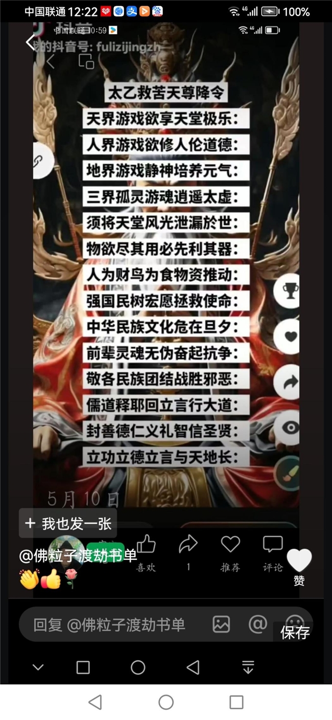 太上曰,祸福无门,惟人自召,善恶之根,如影随形,是以天地有司过之神,依人所犯轻重,以夺人算,算减则贫耗,多逢忧患,人皆恶之,刑福随之。吉庆避之,恶星灾之,算尽则死。又有三台北斗神君,在人头上。录人罪恶,夺其纪算,又有三尸神,在人身中……总结了,“佛经”长寿灭罪十二因缘法一切生命本性,是本论的纲领,也是太上重示训诲的宗旨所在,都是意识心之所为。又曰:所谓善人,人皆敬之,天道佑之,福禄随之。众邪远之,神灵卫之,所作必成,神仙可冀。欲求天仙者,当立一千三百善,欲求地仙者,当立三百善。再曰夫心起于善,善虽未为,而吉神已随之,或心起于恶,恶虽未为,而凶神已随之。其有曾行恶事,后自改悔,诸恶莫作,众善奉行,久久比获吉庆,所谓转祸为福也,故吉人语善,视善行善,一日有三善,三年天必降之福;凶人语恶,视恶行恶,一日有三恶,三年天必降之祸。故不勉而行之。道德经开篇即以十六字为纲,宣扬“善有善报,恶有恶报”的因果观念,接着指出人要长生多福,必须行善积德,并列举了二十六条善行,和一百零七条恶行作趋善避恶的标准,后以诸恶莫作,众善奉行。日日如此,终身谨守。佛粒子意识心自然本能,今劝世人,下根人该读,上根人也该读,天下无人不该读,读后自然感应,所有下下人,能种上上福,福向缓中生。祸向暗中灭,因果报应中,分明向人说,修善受苦者,为善未熟故。至其善熟时,自见受乐报,稽首太上尊。学佛普度一切众,心生一切善,善生一切福,若人受此经,信行及劝导,是名为法施,功德不可量。现代科学认可佛法,但不知怎么接受应用,从而导致,科学越发达,人们思想越空虚,道德意识越低,为此说科学一日不接受确立“佛粒子”让意识心在全国总人数的三分之一都相信知道。社会道德就明显改变。总之,科学一日不接受佛法,世界无一日安宁和谐。佛法是人类精神之食粮,心灵润滑剂,佛经内每一个字是人体每一个细胞的姓名,你只要念他,他就会自动调解你身体健康。