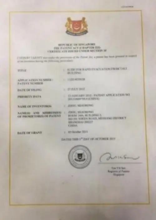 1) 发明专利《高楼快速逃生滑梯》 由上海市政府列为《可行性研究项目》 。 由市建交委牵头各相关单位进行研发。