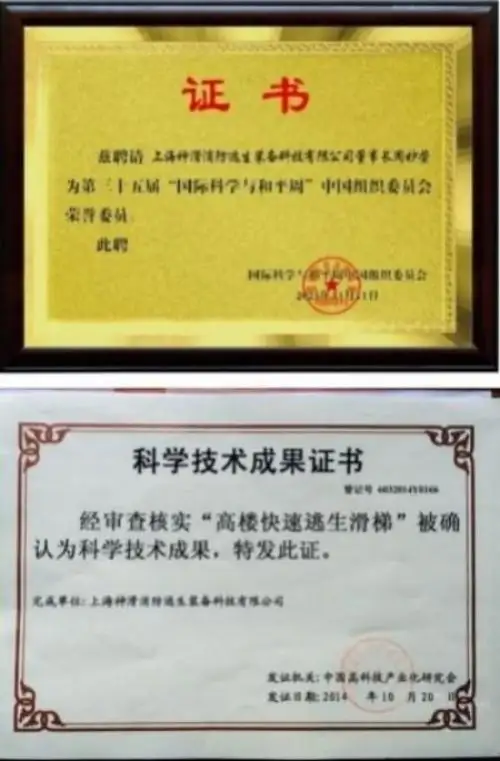 8) 人民日报主办的《新安全东方消防》载文《神奇滑梯诞生记》 指出: "《高楼快速逃生滑梯》”为高层建筑逃生带来了新的曙光如果能投入生产将对我国建筑设计和消防法规修改产生很大的影响。