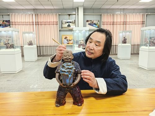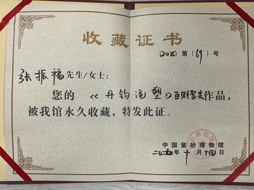 新华资讯网河南讯 (程传忠 报道)1月13日,从周口市郸城县张振福陶瓷泥塑工作室传来好消息,工作室收到了自江苏宜兴寄来的收藏证书,前不久,在中国江苏宜兴陶瓷博览中心举办的河南陶瓷精品展上,郸城泥塑烧制技艺传承人张振福丹钧泥塑精品被中国(宜兴)紫砂博物馆永久收藏。