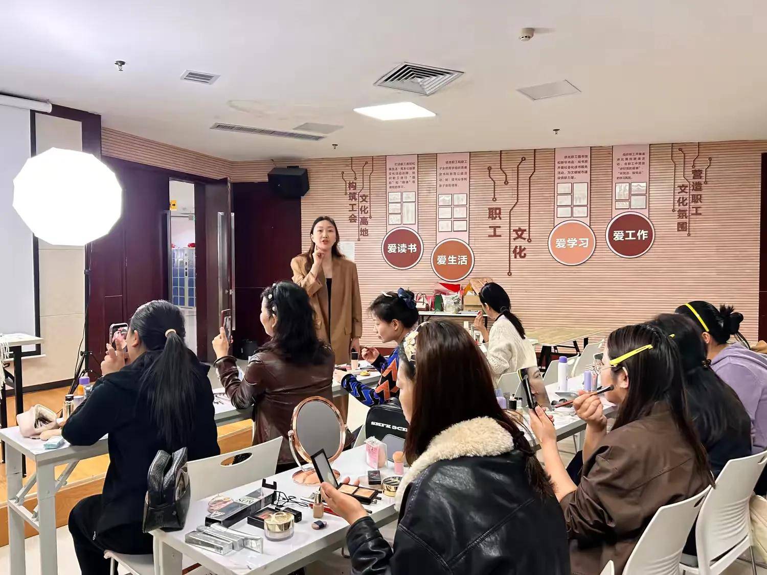 美妆课程围绕“职场通勤妆”“日常伪素颜妆”两大高频场景展开,讲师从底妆服帖技巧、遮瑕定位、眉形修饰、眼妆配色等基础知识点切入,结合不同肤质、骨相特点,手把手教大家如何打造自然不卡粉、精致不厚重的妆容。针对职工姐妹关心的“快速出门妆”等实际需求,讲师通过现场示范,详细拆解了从护肤打底到定妆收尾的全流程,耐心解答大家关于化妆品选择、持妆技巧等疑问,让零基础学员也能轻松上手。