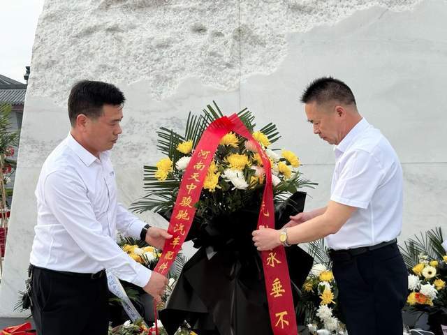 在杨靖宇将军雕塑前,全体人员整齐肃立,神情肃穆,整理衣冠,现场气氛庄严凝重。祭奠仪式上,总经理和副总经理缓步上前,庄重地向杨靖宇将军敬献花篮并整理缎带,寄托无尽哀思。随后,全体人员面向将军塑像行注目礼,深切缅怀这位从驻马店走出去的抗日民族英雄。