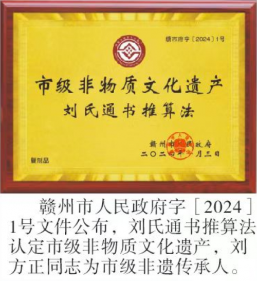 恩师刘方正承接《刘氏天星推算法》,于2023年被赣州市评为非物质文化传承人。